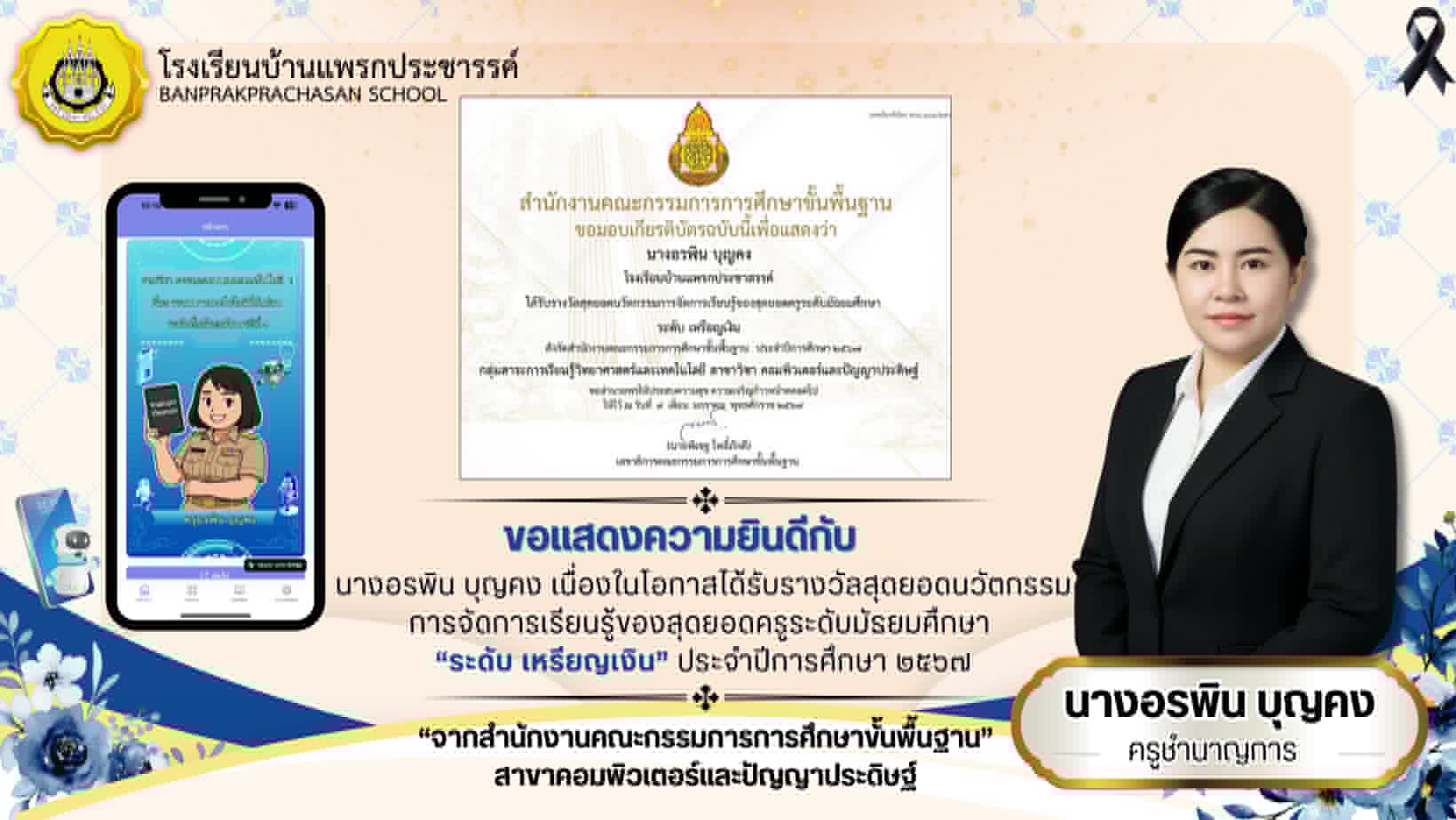 รางวัลสุดยอดนวัตกรรมการจัดการเรียนรู้ของสุดยอดครูระดับมัธยมศึกษา "ระดับ เหรียญเงิน" ประจำปีการศึกษา ๒๕๖๗ "จากสำนักงานคณะกรรมการการศึกษาขั้นพื้นฐาน"สาขาคอมพิวเตอร์และปัญญาประดิษฐ์ |